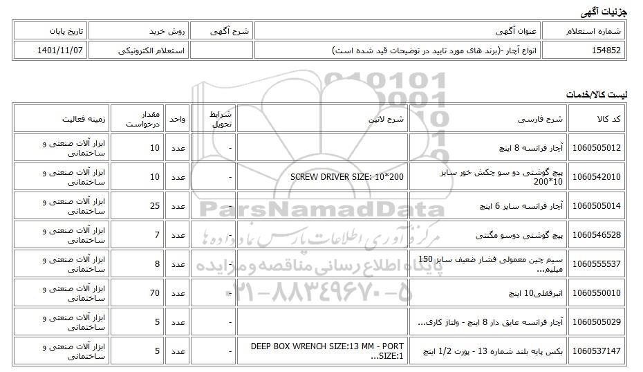 | 154852 | انواع آچار -(برند های مورد تایید در توضیحات قید شده است) | استعلام الکترونیکی | 1401/11/07 |