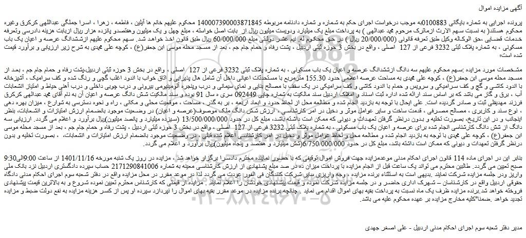 پرونده اجرایی به شماره بایگانی 0100883به موجب درخواست اجرای حکم به شماره و شماره دادنامه مربوطه 140007390003871845 محکوم علیهم خانم ها آیلین ، فاطمه ، زهرا ، اسرا جملگی عبداللهی کرکرق وغیره محکوم هستند( به نسبت سهم الارث ازماترک مرحوم محمد عبدالهی ) به پرداخت مبلغ یک میلیارد ودویست میلیون ریال از بابت اصل خواسته ، مبلغ چهل و یک میلیون وهفتصدو پانزده هزار ریال ازبابت هزینه دادرسی وتعرفه خدمات قضایی ،حق الوکاله وکیل طبق تعرفه قانونی (20/000/000 ریال ) در حق محکوم له. نیم عشر دولتی مبلغ 60/000/000 ریال طبق قانون اخذ خواهد شد. سهم محکوم علیهم ازششدانگ عرصه و اعیان یک باب مسکونی ، به شماره پلاک ثبتی 3232 فرعی از 127 اصلی ، واقع در بخش 3 حوزه ثبتی اردبیل ، پشت رفاه و حمام جام جم ، بعد از مسجد محله موسی ابن جعفر(ع) ، کوچه علی محمدی به شرح زیر ارزیابی و برآورد قیمت شده است؛