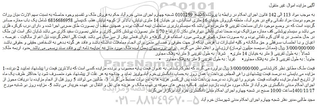 به موجب مواد 113 الی 142 قانون اجرای احکام در رابطه با پرونده کلاسه  0101259 شعبه چهارم اجرای مدنی خرم آباد حکم به فروش ملک و تقسیم وجوه حاصله به نسبت سهم الارث میان وراث مرحوم دوست مراد دلفانی واقع در خرم آباد، منطقه کوروش خیابان 16 متری اسدآبادی، بر خیابان 14 متری نیایش، بالاتر از کوچه نیایش هفتم، کدپستی 6816686958 شامل یک باب مغازه صادر گردیده است که در وضع موجود دارای مساحت تقریبی 9 مترمربع می باشد که سیستم باربری ساختمان نیمه اسکلت بوده و همچنین سقف آن بصورت طاق ضربی اجرا شده و دارای درب کرکره فلزی می باشد و سیستم پوششی کف مغازه موزائیک بوده ضمنا نمای داخلی دیوارهای دکان تا ارتفاع 1/70 متر بصورت پوشش کاشی کاری و مابقی بصورت سفید کاری می باشد شایان ذکر است این ملک در حال حاضر در ید آقای کرم دلفانی بوده و به صورت مغازه کبوتر فروشی مورد استفاده قرار گرفته و دارای قدمتی بیش از سی سال می باشد .قیمت کلی اعلام گردیده ذیل اعم از مالکیت ، عرصه ، اعیان و با احتساب سرقفلی و حق مالکانه و کلیه امتیازات با فرض اینکه از جهت حقوقی و قضایی منعی برای انجام معاملات نداشته باشد و فاقد هر گونه بدهی به اشخاص حقیقی و حقوقی باشد  3/000/000/000 ریال (معادل سیصد میلیون تومان) ارزیابی و اعلام نظر می گردد . برابر بررسیهای بعمل آمده ملک مورد منازعه  مبایعه نامه ای و فاقد سند رسمی می باشد .حدود اربعه ملک:     شمالاً : به طول تقریبی 3 متر به خیابان 14 متری•    شرقاً : به طول تقریبی 3 متر به پلاک مجاور