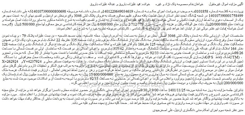 پرونده به کلاسه شماره 0101858به موجب درخواست اجرای حکم به شماره 1401220649034619و شماره دادنامه مربوطه 140107390000800698که طی دادنامه شماره 140107390001758499 در شعبه 2دادگاه تجدید نظر استان اردبیل قطعیت یافته محکوم علیهم محکوم هستند به فروش پلاک ثبتی 3046 واقع دربخش دو اردبیل و تقسیم بهای آن به نسبت سهم هر یک از اصحاب دعوی با لحاظ ارزش قیمت تکمیلی و احداثی خوانده ردیف اول ( محمد علیزاده ) و پرداخت آن به ایشان و تقسیم باقیمانده به شرح دادنامه مذکور به سایر وراث بابت اصل خواسته و پرداخت مبلغ 20/000/000ریال بابت حق الوکاله وکیل و هزینه دادرسی به میزان 2/712/779 ریال و مبلغ 6/000/000 ریال حق الزحمه کارشناسی درحق محکوم لها،مبلغ 1/500/000ریال (5درصد اصل خواسته )بابت نیم عشر دولتی نیز از ایشان اخذ خواهد شدو پس از ارجاع به کارشناسی ، کارشناس مربوطه نظریه خود را به شرح زیر اعلام نمودند: