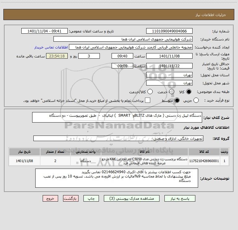 نام دستگاه خریدار:شرکت هواپیمایی جمهوری اسلامی ایران هما