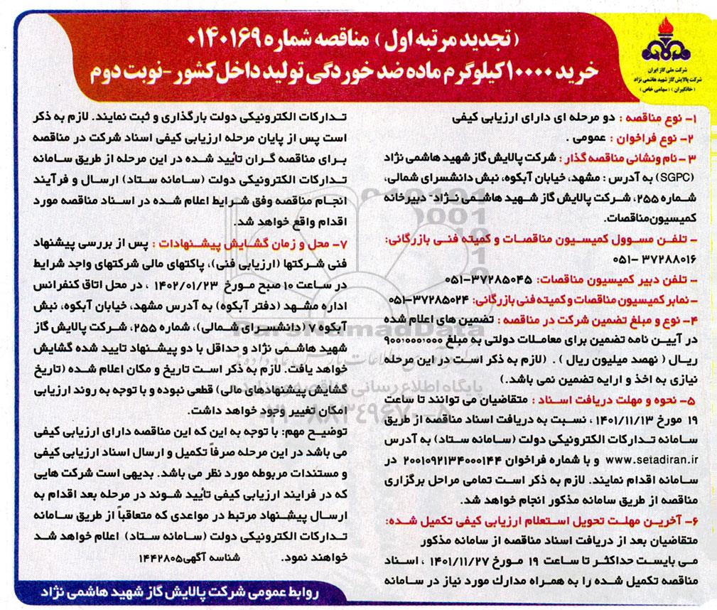 تجدید مرتبه اول مناقصه شماره 0140169 - نوبت دوم