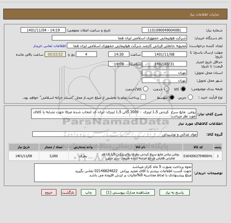 | 1 | 0164200275400041 | روغن نباتی مایع سرخ کردنی بطری پلاستیکی 1/5 Lit نام تجارتی هایلی مرجع عرضه کننده طبیعت سبز میهن | بطری | 3,000 | 1401/11/08 |