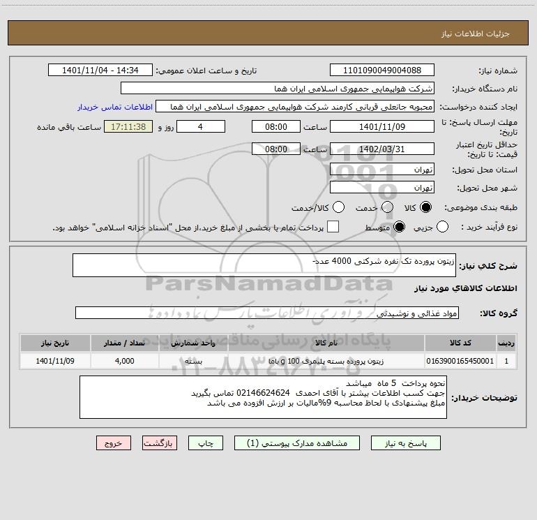 شرح کلی نیاز: زیتون پرورده تک نفره شرکتی 4000 عدد-