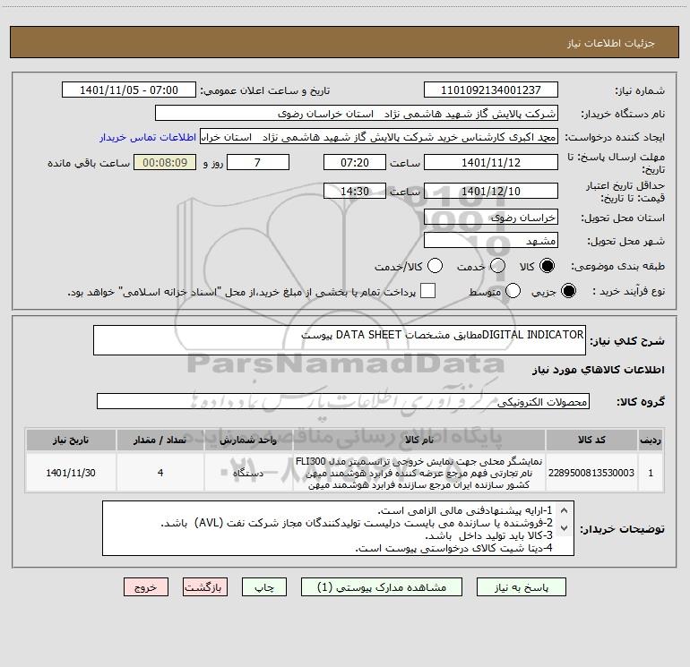 شرح کلی نیاز: DIGITAL INDICATORمطابق مشخصات DATA SHEET پیوست