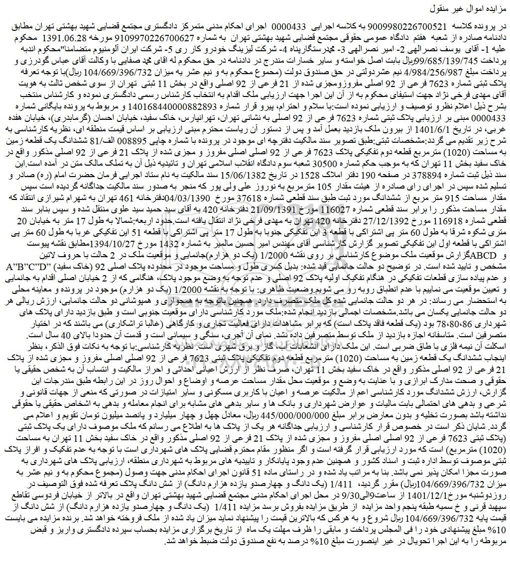 مزایده پلاک ثبتی شماره 7623 فرعی از 92 اصلی, مزایده پلاک ثبتی شماره 7623 فرعی از 92 اصلی