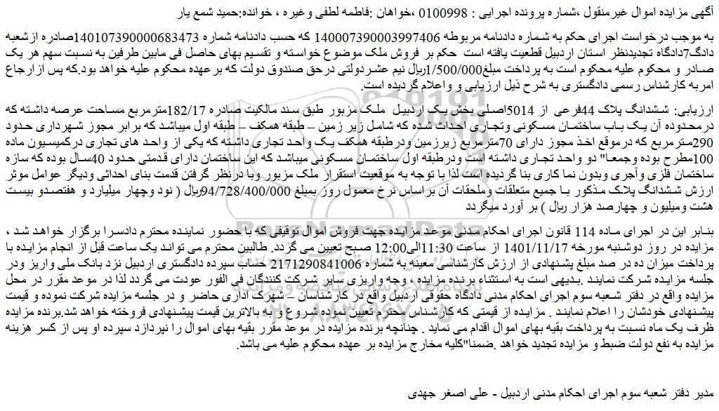 آگهی مزایده اموال غیرمنقول ،شماره پرونده اجرایی : 0100998 ،خواهان :فاطمه لطفی وغیره ، خوانده:حمید شمع یار