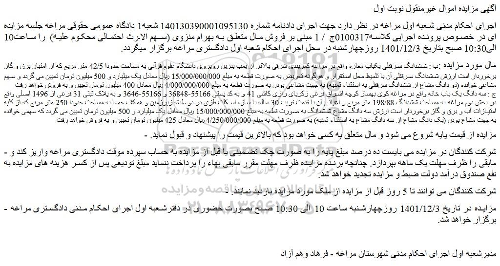 اجرای احکام مدنی شعبه اول مراغه در نظر دارد جهت اجرای دادنامه شماره 140130390001095130 شعبه1 دادگاه عمومی حقوقی مراغه جلسه مزایده ای در خصوص پرونده اجرایی کلاسه0100317ج / 1 مبنی بر فروش مال متعلق به بهرام منزوی (سهم الارث احتمالی محکوم علیه) را ساعت10 الی10:30 صبح بتاریخ 1401/12/3 روزچهارشنبه در محل اجرای احکام شعبه اول دادگستری مراغه برگزار میگردد.