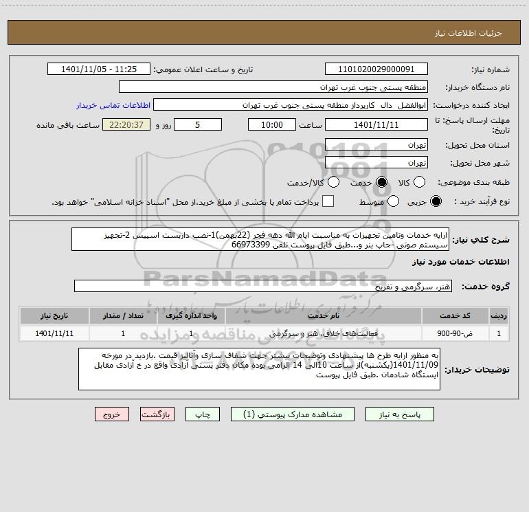 شرح کلی نیاز: ارایه خدمات وتامین تجهیزات به مناسبت ایام الله دهه فجر (22بهمن)1-نصب داربست اسپیس 2-تجهیز سیستم صوتی -جاپ بنر و...طبق فایل پیوست تلفن 66973399