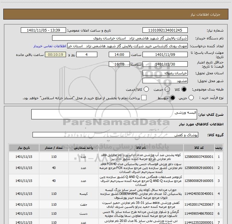 نام دستگاه خریدار:شرکت پالایش گاز شهید هاشمی نژاد استان خراسان رضوی