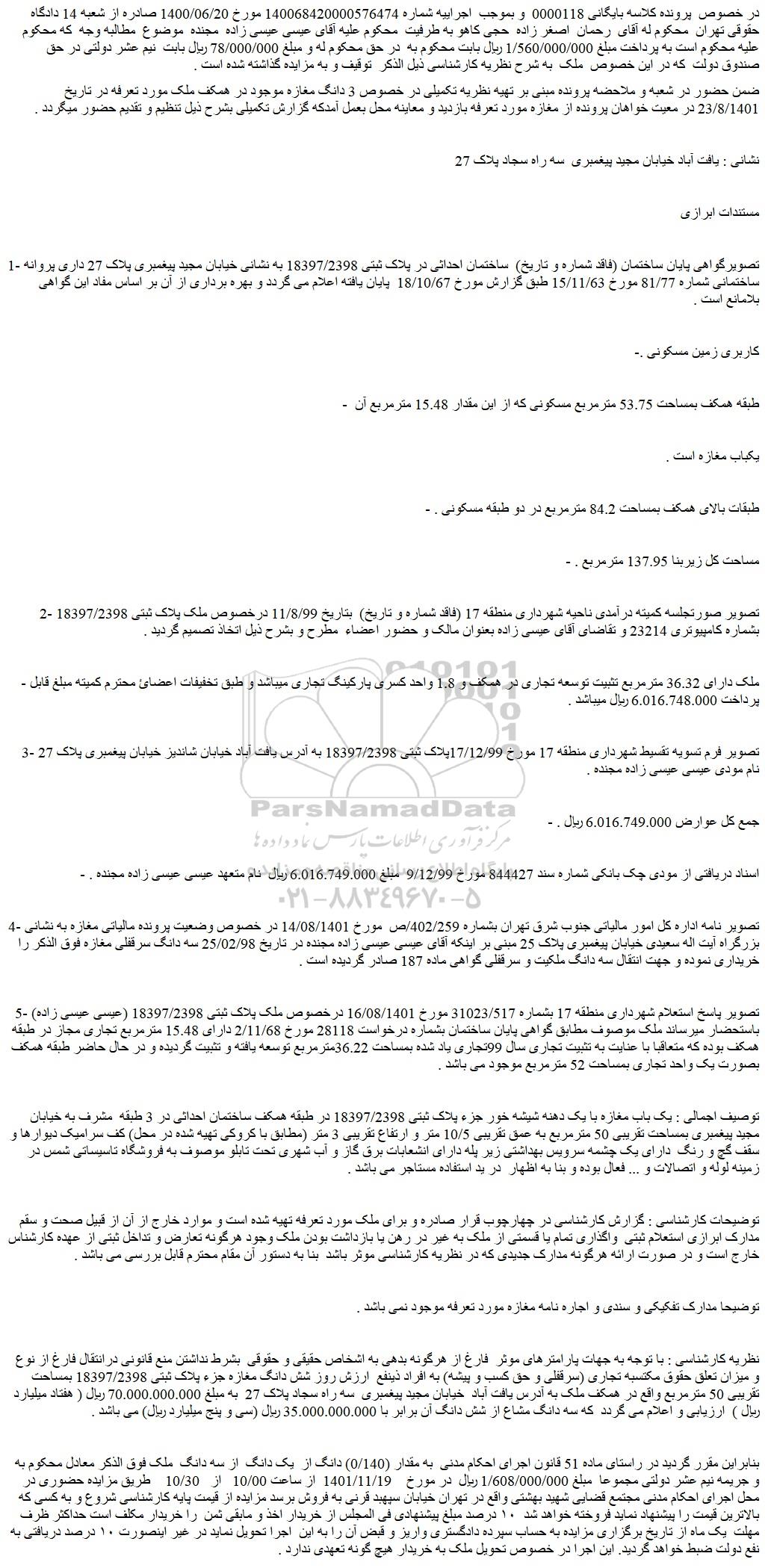 در خصوص پرونده کلاسه بایگانی 0000118 و بموجب اجراییه شماره 140068420000576474 مورخ 1400/06/20 صادره از شعبه 14 دادگاه حقوقی تهران محکوم له آقای رحمان اصغر زاده حجی کاهو به طرفیت محکوم علیه آقای عیسی عیسی زاده مجنده موضوع مطالبه وجه که محکوم علیه محکوم است به پرداخت مبلغ 1/560/000/000 ریال بابت محکوم به در حق محکوم له و مبلغ 78/000/000 ریال بابت نیم عشر دولتی در حق صندوق دولت که در این خصوص ملک به شرح نظریه کارشناسی ذیل الذکر توقیف و به مزایده گذاشته شده است .