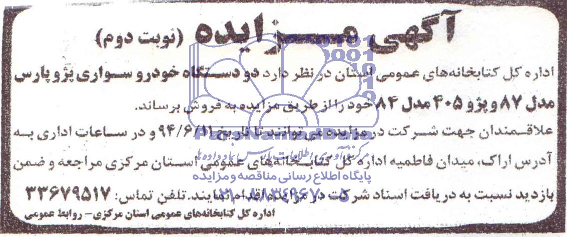 اداره کل کتابخانه های عمومی استان مرکزی در نظر دارد دو دستگاه خودروی سواری پژو پارس مدل 87 و پژو 405 مدل 84 خود را از طریق مزایده به فروش برساند.