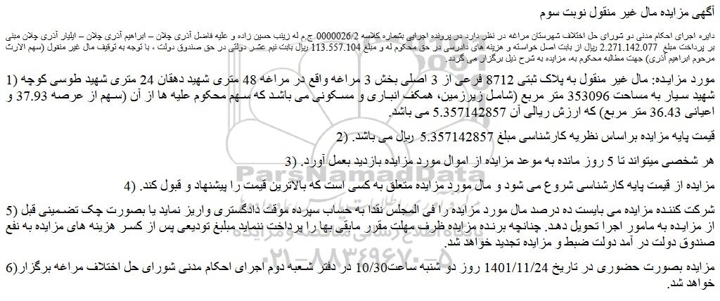 دایره اجرای احکام مدنی دو شورای حل اختلاف شهرستان مراغه در نظر دارد در پرونده اجرایی بشماره کلاسه 0000026/2 ج.م له زینب حسین زاده و علیه فاضل آذری چلان – ابراهیم آذری چلان – ایلیار آذری چلان مبنی بر پرداخت مبلغ 2.271.142.077 ریال از بابت اصل خواسته و هزینه های دادرسی در حق محکوم له و مبلغ 113.557.104 ریال بابت نیم عشر دولتی در حق صندوق دولت ، با توجه به توقیف مال غیر منقول (سهم الارث مرحوم ابراهیم آذری) جهت مطالبه محکوم به، مزایده به شرح ذیل برگزار می گردد.