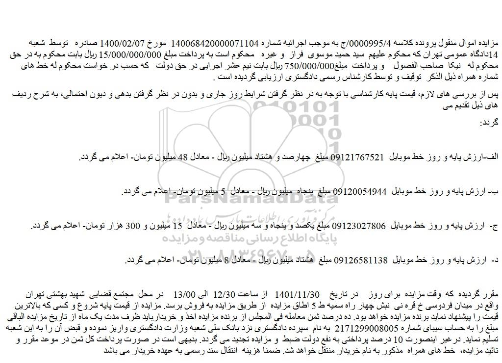 مزایده اموال منقول پرونده کلاسه 0000995/4/ج به موجب اجرائیه شماره 140068420000071104  مورخ 1400/02/07 صادره   توسط  شعبه 14دادگاه عمومی تهران که محکوم علیهم  سید حمید موسوی  فراز  و غیره   محکوم است به پرداخت مبلغ 15/000/000/000 ریال بابت محکوم به در حق محکوم له   نیکا  صاحب الفصول    و پرداخت  مبلغ750/000/000 ریال بابت نیم عشر اجرایی در حق دولت   که حسب در خواست محکوم له خط های شماره همراه ذیل الذکر  توقیف و توسط کارشناس رسمی دادگستری ارزیابی گردیده است .