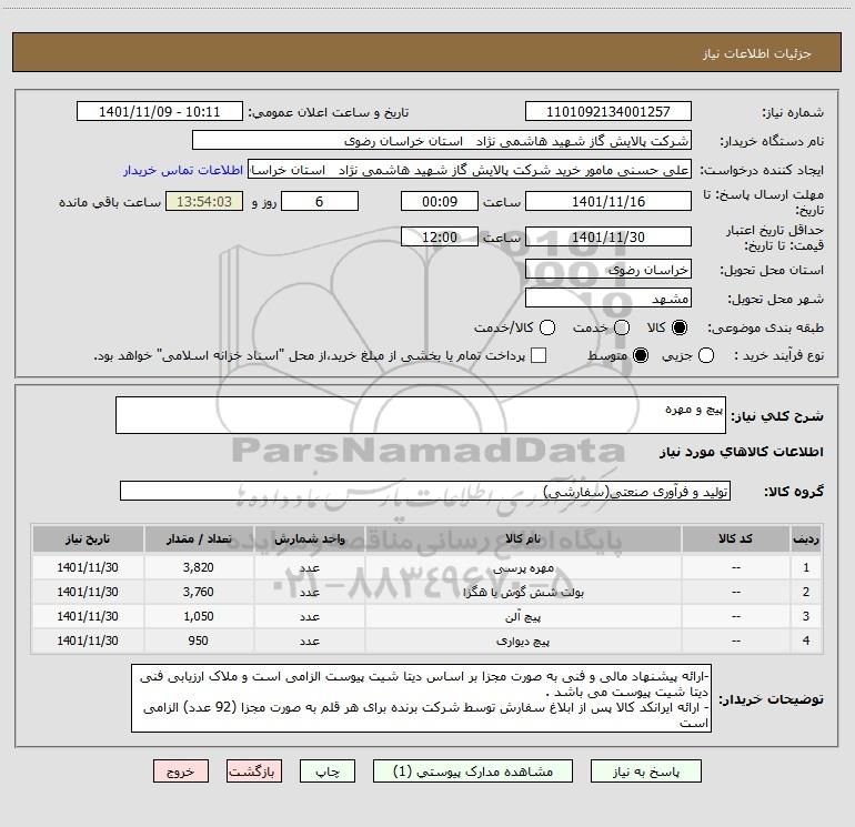 نام دستگاه خریدار:شرکت پالایش گاز شهید هاشمی نژاد استان خراسان رضوی