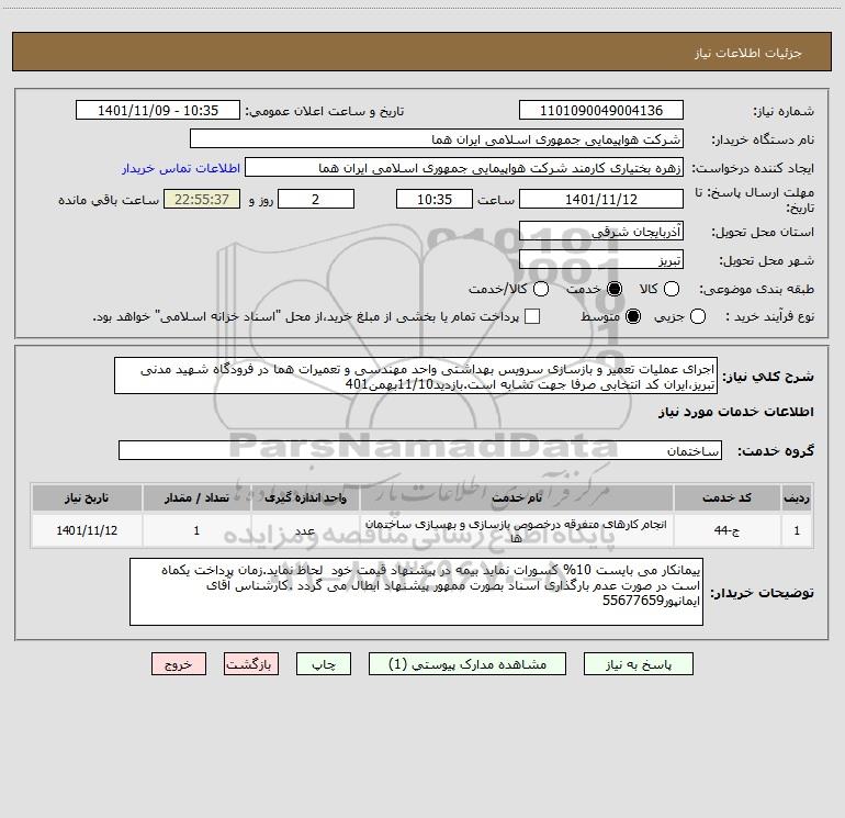 شرح کلی نیاز: اجرای عملیات تعمیر و بازسازی سرویس بهداشتی واحد مهندسی و تعمیرات هما در فرودگاه شهید مدنی تبریز،ایران کد انتخابی صرفا جهت تشابه است.بازدید11/10بهمن401