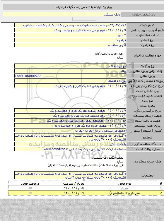 واگذاری امورمربوط به مدیریت نصب، راه اندازی و پشتیبانی ابزارهای پرداخت الکترونیک (۳۰.۰۰۰ پایانه سیار) به مدت ۳ سال