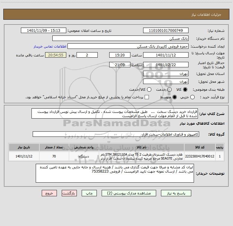 شرح کلی نیاز: قرارداد خرید دیسک سخت ... طبق مشخصات پیوست شده ، تکمیل و ارسال پیش نویس قرارداد پیوست شده تا قبل از اتمام مهلت ارسال پاسخ الزامیست