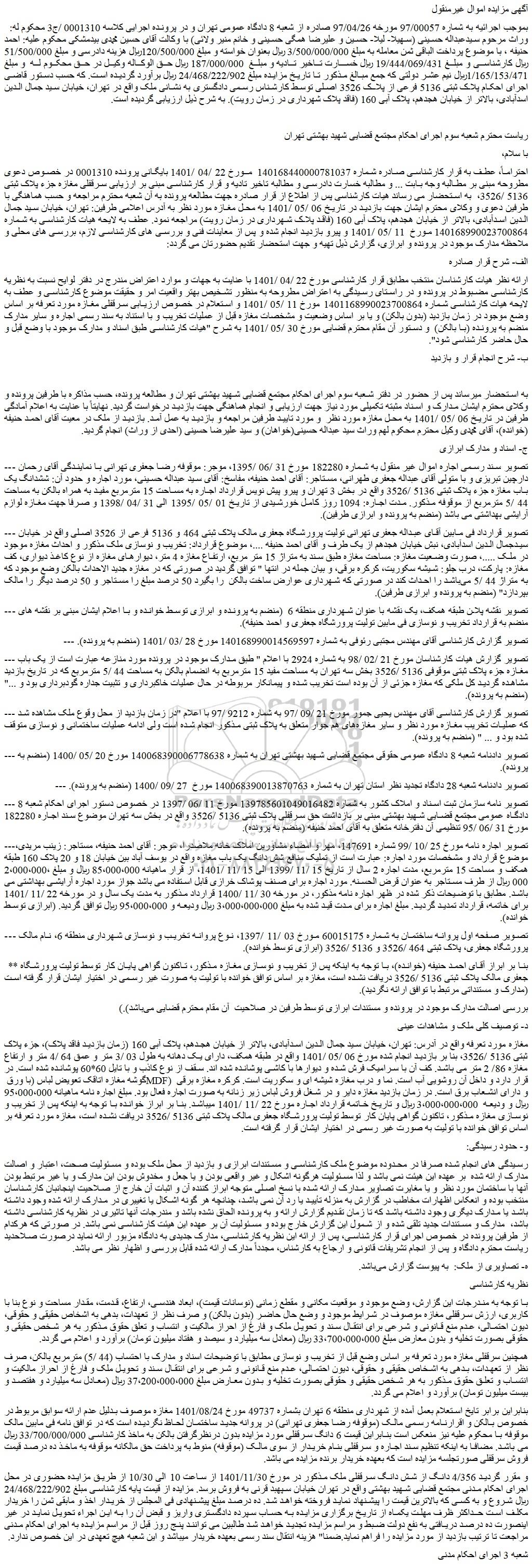 به استحضار میرساند پس از حضور در دفتر شعبه سوم اجرای احکام مجتمع قضایی شهید بهشتی تهران و مطالعه پرونده، حسب مذاکره با طرفین پرونده و وکلای محترم ایشان مدارک و اسناد مثبته تکمیلی مورد نیاز جهت ارزیابی و انجام هماهنگی جهت بازدید درخواست گردید. نهایتاً با عنایت به اعلام آمادگی طرفین در تاریخ 06 /05 /1401 به محل مغازه مورد نظر و مورد تایید طرفین مراجعه و بازدید به عمل آمد. بازدید از ملک در معیت آقای احمد حنیفه (خوانده)، آقای محمدی وکیل محترم محکوم لهم وراث سید عبداله حسینی(خواهان) و سید علیرضا حسینی (احدی از وراث) انجام گردید.