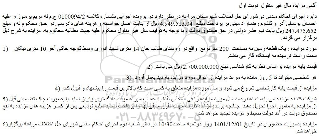 دایره اجرای احکام مدنی دو شورای حل اختلاف شهرستان مراغه در نظر دارد در پرونده اجرایی بشماره کلاسه 0100094/2 ج.م له مریم پرموز و علیه احسان یوسفی آذر و کلثوم رضازاد مبنی بر پرداخت مبلغ 4.949.513.04 ریال از بابت اصل خواسته و هزینه های دادرسی در حق محکوم له و مبلغ 247.475.652 ریال بابت نیم عشر دولتی در حق صندوق دولت ، با توجه به توقیف مال غیر منقول محکوم علیه جهت مطالبه محکوم به، مزایده به شرح ذیل برگزار می گردد.