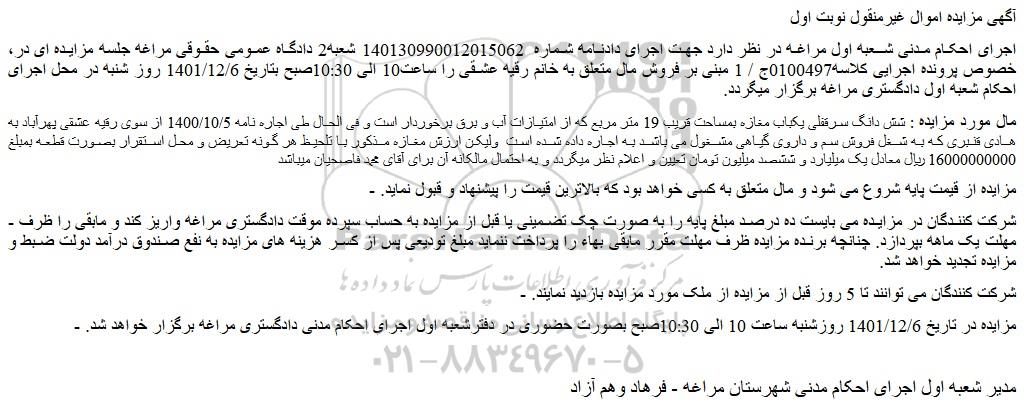 - مزایده در تاریخ 1401/12/6 روزشنبه ساعت 10 الی 10:30صبح بصورت حضوری در دفترشعبه اول اجرای احکام مدنی دادگستری مراغه برگزار خواهد شد.