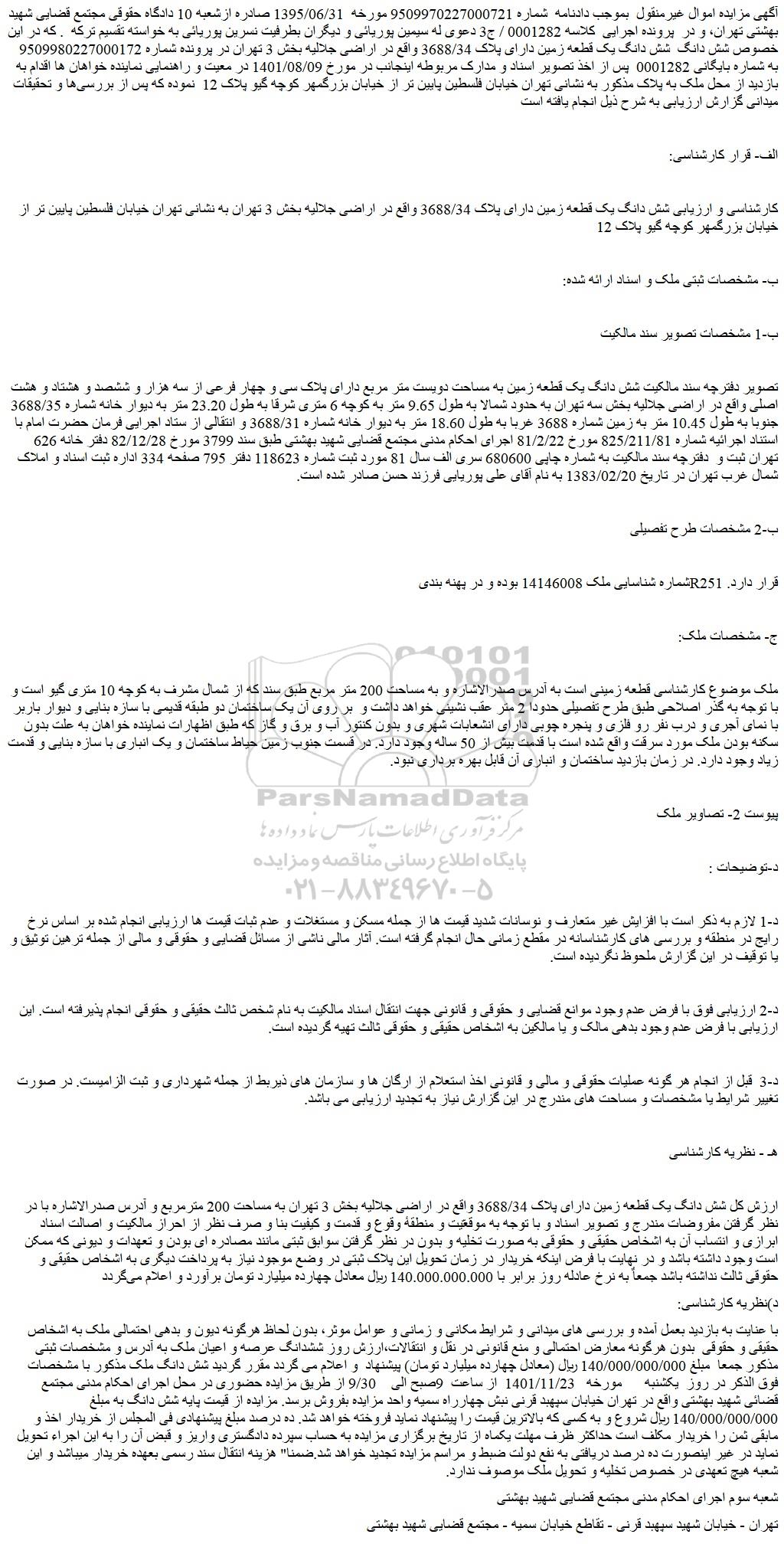 آگهی مزایده اموال غیرمنقول بموجب دادنامه شماره 9509970227000721 مورخه 1395/06/31 صادره ازشعبه 10 دادگاه حقوقی مجتمع قضایی شهید بهشتی تهران، و در پرونده اجرایی کلاسه 0001282 / ج3 دعوی له سیمین پوریائی و دیگران بطرفیت نسرین پوریائی به خواسته تقسیم ترکه . که در این خصوص شش دانگ شش دانگ یک قطعه زمین دارای پلاک 3688/34 واقع در اراضی جلالیه بخش 3 تهران در پرونده شماره 9509980227000172 به شماره بایگانی 0001282 پس از اخذ تصویر اسناد و مدارک مربوطه اینجانب در مورخ 1401/08/09 در معیت و راهنمایی نماینده خواهان ها اقدام به بازدید از محل ملک به پلاک مذکور به نشانی تهران خیابان فلسطین پایین تر از خیابان بزرگمهر کوچه گیو پلاک 12 نموده که پس از بررسی ها و تحقیقات میدانی گزارش ارزیابی به شرح ذیل انجام یافته است
