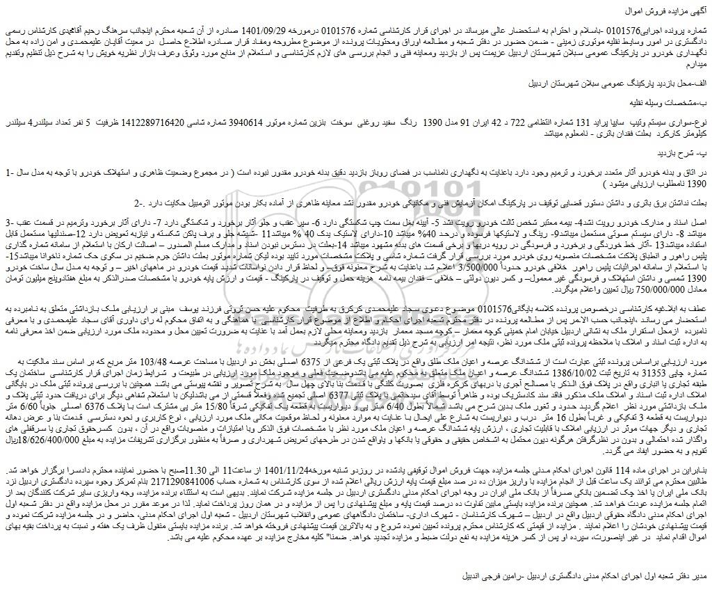 شماره پرونده اجرایی0101576 -باسلام و احترام به استحضار عالی میرساند در اجرای قرار کارشناسی شماره 0101576 درمورخه 1401/09/29 صادره از آن شعبه محترم اینجانب سرهنگ رحیم آقامحمدی کارشناس رسمی دادگستری در امور وسایط نقلیه موتوری زمینی - ضمن حضور در دفتر شعبه و مطالعه اوراق ومحتویات پرونده از موضوع مطروحه ومفاد قرار صادره اطلاع حاصل در معیت آقایان علیمحمدی و امن زاده به محل نگهداری خودرو در پارکینگ عمومی سبلان شهرستان اردبیل عزیمت پس از بازدید ومعاینه فنی و انجام بررسی های لازم کارشناسی و استعلام از منابع مورد وثوق وعرف بازار نظریه خویش را به شرح ذیل تنظیم وتقدیم میدارم