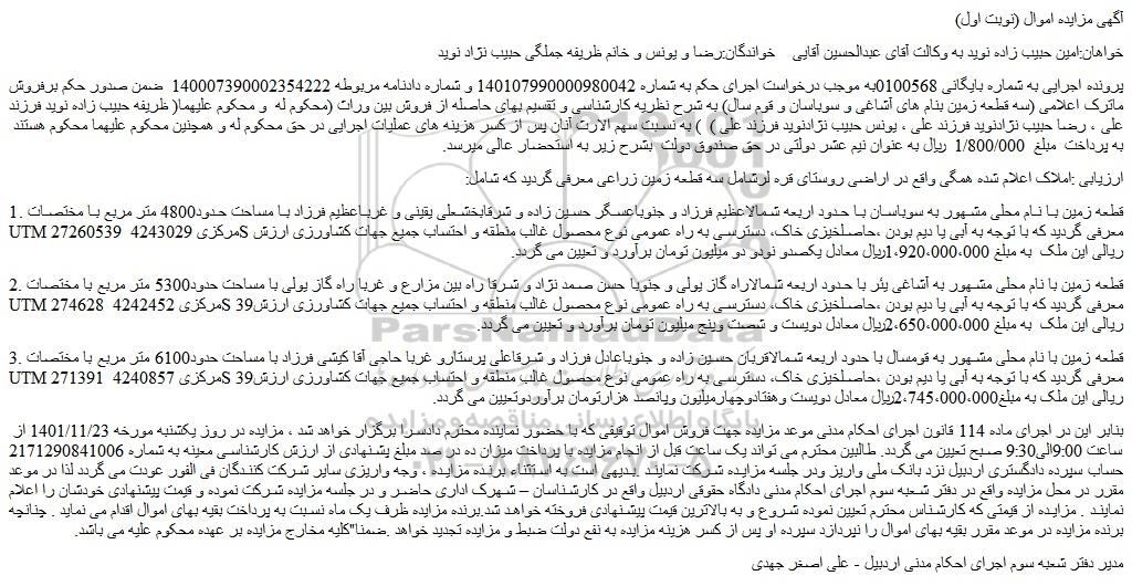 پرونده اجرایی به شماره بایگانی 0100568به موجب درخواست اجرای حکم به شماره 140107990000980042 و شماره دادنامه مربوطه 140007390002354222 ضمن صدور حکم برفروش ماترک اعلامی (سه قطعه زمین بنام های آشاغی و سوباسان و قوم سال) به شرح نظریه کارشناسی و تقسیم بهای حاصله از فروش بین وراث (محکوم له و محکوم علیهما( ظریفه حبیب زاده نوید فرزند علی ، رضا حبیب نژادنوید فرزند علی ، یونس حبیب نژادنوید فرزند علی ) ) به نسبت سهم الارث آنان پس از کسر هزینه های عملیات اجرایی در حق محکوم له و همچنین محکوم علیهما محکوم هستند به پرداخت مبلغ 1/800/000 ریال به عنوان نیم عشر دولتی در حق صندوق دولت بشرح زیر به استحضار عالی میرسد.