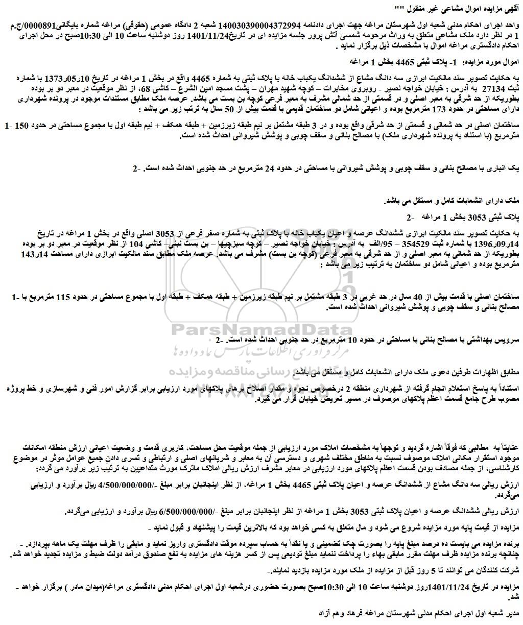 اموال مورد مزایده: 1- پلاک ثبتی 4465 بخش 1 مراغه