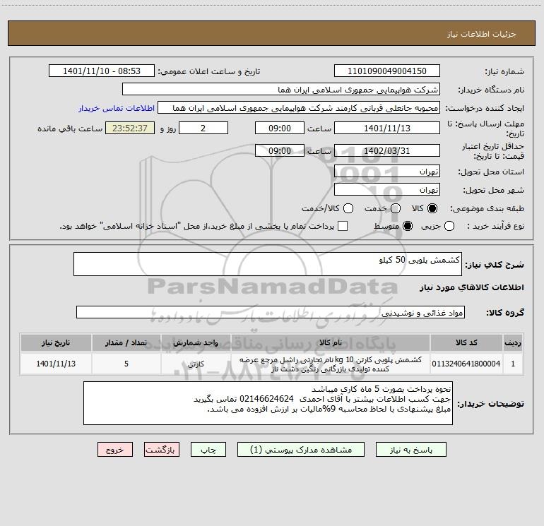 شرح کلی نیاز: کشمش پلویی 50 کیلو