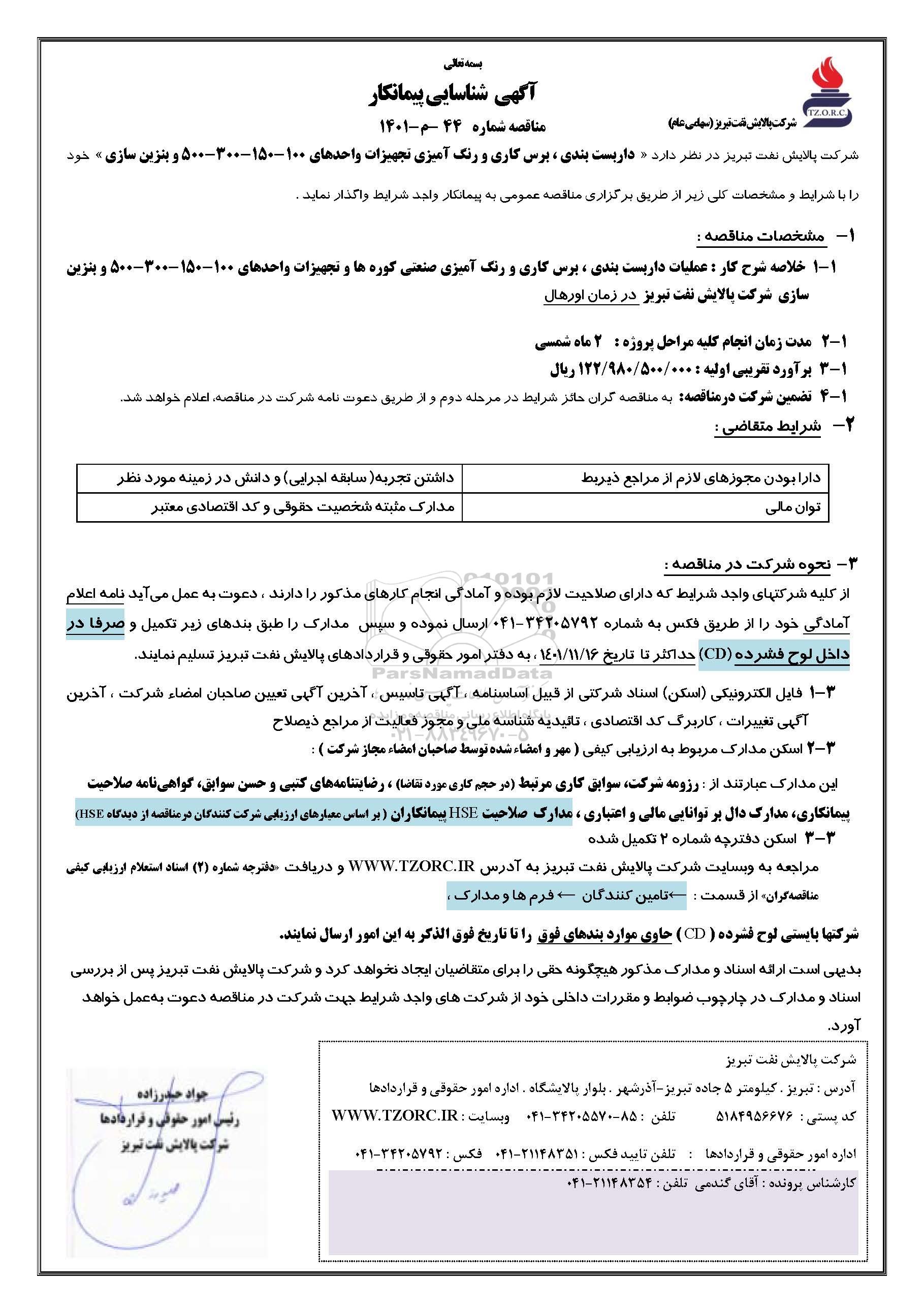 از کلیه شرکتهای واجد شرایط که دارای صلاحیت لازم بوده و آمادگی انجام کارهای مذکور را دارند دعوت به عمل می آید نامه اعلام آمادگی خود را از طریق فکس به شماره 34205792-041 ارسال نموده و سپس مدارک را طبق بندهای زیر تکمیل و صرفا در داخل لوح فشرده (cd) حداکثر تا تاریخ 1401.11.16 به دفتر امور حقوقی و قراردادهای پالایش نفت تبریز تسلیم نمایند