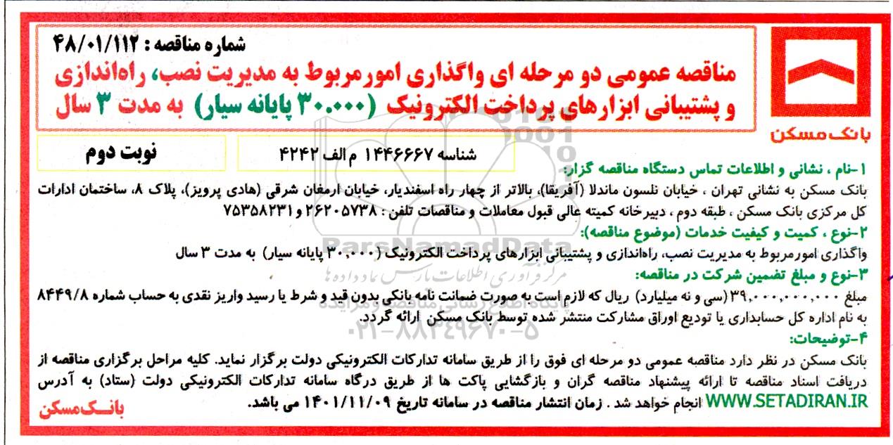واگذاری امور مربوط به مدیریت نصب، راه اندازی و پشتیبانی ابزارهای پرداخت الکترونیک (30.000 پایانه سیار) به مدت 3 سال