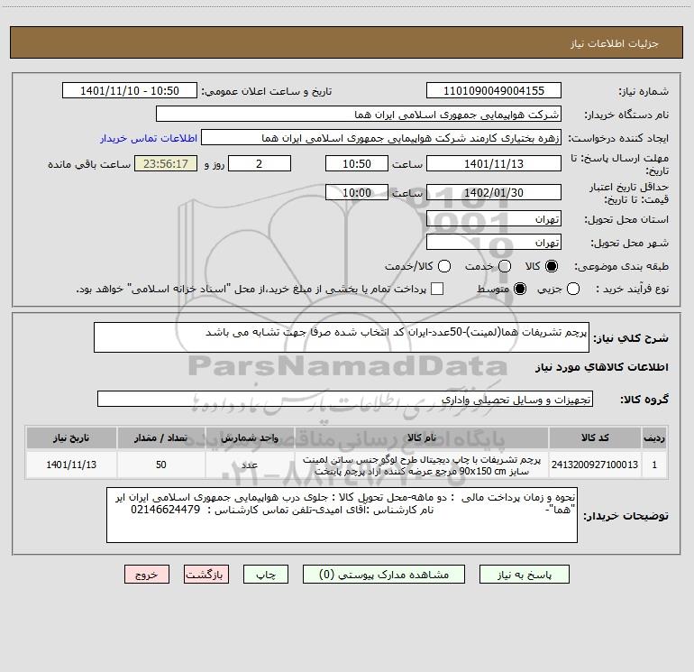 شرح کلی نیاز: پرچم تشریفات هما(لمینت)-50عدد-ایران کد انتخاب شده صرفا جهت تشابه می باشد
