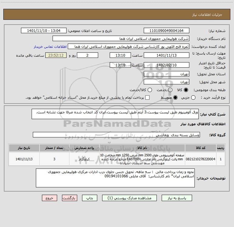 شرح کلی نیاز: ورق آلومینیوم طبق لیست پیوست،3 آیتم طبق لیست پیوست،ایران کد انتخاب شده صرفا جهت تشابه است.