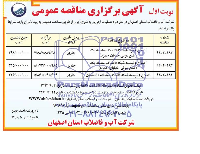 شرکت آب و فاضلاب استان اصفهان در نظر دارد عملیات اجرایی به شرح زیر را از طریق مناقصه عمومی به پیمانکاران واجد شرایط واگذار نماید.