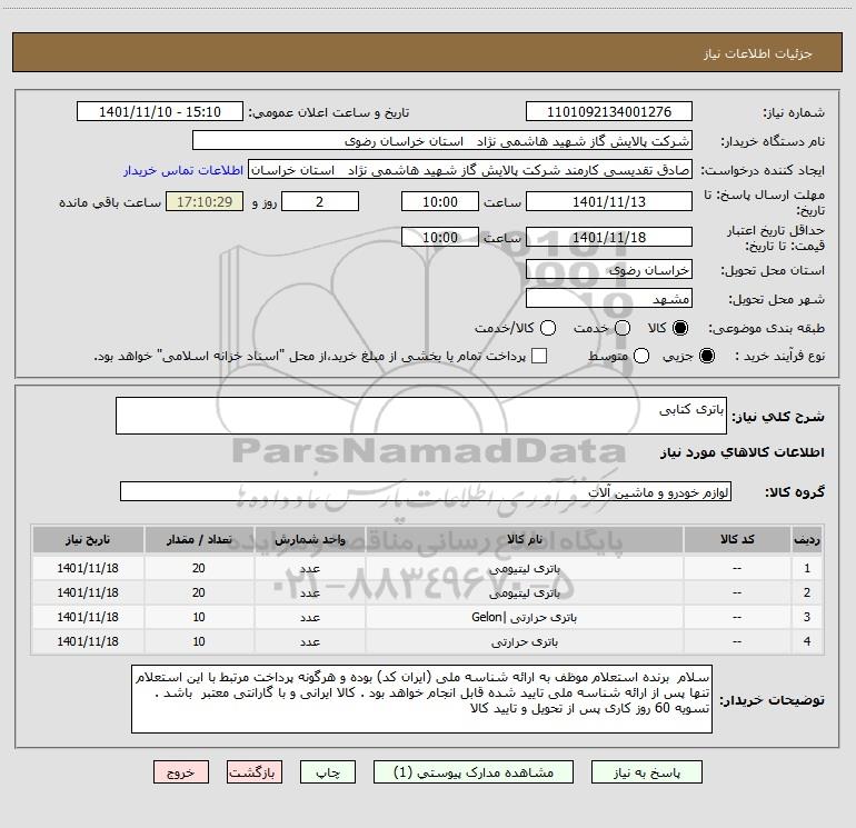 نام دستگاه خریدار:شرکت پالایش گاز شهید هاشمی نژاد استان خراسان رضوی