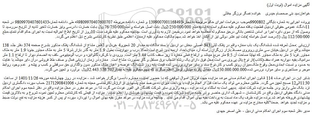 پرونده اجرایی به شماره بایگانی 9900802بموجب درخواست اجرای حکم مربوطه به شماره1399007001168493 و شماره دادنامه مربوطه 9809970407600707که طی دادنامه شماره9809970407601433 در شعبه 11دادگاه عمومی حقوقی اردبیل قطعیت یافته محکوم علیه محکوم است به تادیه مبلغ 2/250/000/000ریال بابت اصل خواسته و مبلغ76/750/000 ریال بابت خسارت دادرسی ونیز خسارت تاخیر تادیه از تاریخ سررسید تا وصول که از سوی دایره اجرا بر اساس شاخص بانکی درحق محکوم له محاسبه خواهد نمود.درضمن لازم به یادآوری است ،چنانچه محکوم علیه ظرف مدت 10روز از تاریخ ابلاغ اجرائیه نسبت به اجرای حکم اقدام ننماید،مبلغ 112/500/000 ریال (5درصد اصل خواسته )بابت نیم عشر دولتی نیز از ایشان اخذ خواهد شد.سهم مالکیت محکوم علیه ازمغازه اعلامی طبق نظریه کارشناسی بشرح ذیل اعلام می گردد.