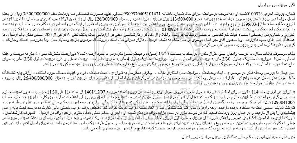 2 مزایده فروش مقدار 14.58سهم از 100 سهم مشاع از پلاک ثبتی 216فرعی از 111اصلی بخش21بنام مرحوم عزیزرفیعی 9816666 1404/08/17 new not special not payed اردبیل
