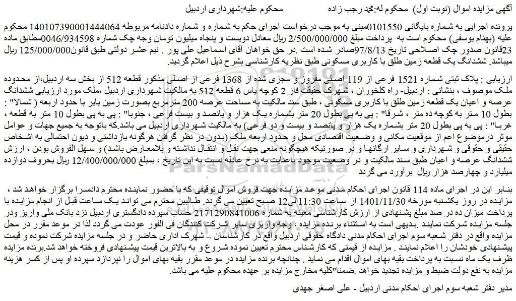 آگهی مزایده اموال (نوبت اول) محکوم له:محمد رجب زاده محکوم علیه:شهرداری اردبیل
