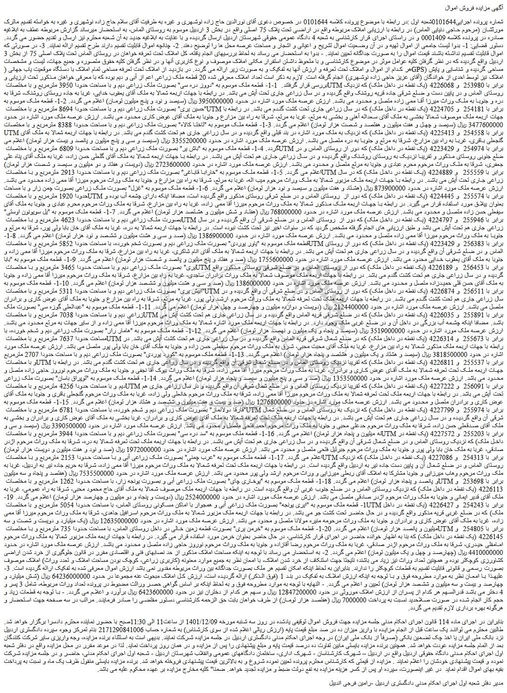 شماره پرونده اجرایی0101644شعبه اول :در رابطه با موضوع پرونده کلاسه 0101644 در خصوص دعوی آقای نورالدین حاج زاده نوشهری و غیره به طرفیت آقای سلام حاج زاده نوشهری و غیره به خواسته تقسیم ماترک مورثشان (مرحوم حاجی دنیایی الماس) در رابطه با ارزیابی املاک مربوطه واقع در اراضی تحت پلاک 75 اصلی واقع در بخش 3 اردبیل موسوم به روستای الماس، به استحضار میرساند گزارش مربوطه عطف به ابلاغیه صادره در پرونده کلاسه 0001409 و در راستای اجرای قرار کارشناسی به شعبه 4 دادگاه عمومی حقوقی شهرستان اردبیل ارسال گردیده و با عنایت به ابلاغیه جدید به آن شعبه محترم نیز ارسال و تقدیم حضور می گردد. دستور قضایی: 1- بدوا لیست جامعی از اموال تھیه و در آن وضعیت اموال تشریح و اعیانی و اشجار و مساحت عرصه محل ھا را توضیح دھند. 2- چنانچه اموال قابلیت تقسیم دارند طرح تقسیم ارائه نمایند. 3- در صورتی که اموال قابلیت تقسیم نداشته باشند قیمت اموال را به صورت جداگانه تعیین نمایند. - بدوا به استحضار می رساند به لحاظ بررسیهای انجام یافته، کل املاک تحت تعرفه خواهان در روستای الماس تحت پلاک اصلی 75 از بخش 3 اردبیل واقع گردیده که در نظر گرفتن کلیه عوامل موثر در موضوع کارشناسی و با ملحوظ داشتن استقرار مکانی املاک موصوف و نوع کاربری آنها و در نظر گرفتن کلیه حقوق متصوره و جمیع جهات، لیست و مشخصات هر کدام از اموال و املاک تحت تعرفه و ارزش آنها به تفکیک و به صورت زیر ارائه می گردد. در بازدید از املاک تحت تعرفه مساحی تمام املاک با دستگاه موقعیت یاب جهانی (GPS) مساحی گردیده و شناسایی و پایش املاک نیز توسط احدی از خواندگان (آقای عزیز حاجی زاده نوشهری) انجام گرفته است. لازم به ذکر است تعداد املاک معرفی شده 20 قطعه ملک زراعی اعم از آبی و دیم بوده که با معرفی خواهان مذکور تحت ارزیابی و بررسی قرار گرفتند. 1-1- قطعه ملک موسوم به "دووز دره سی" بصورت ملک زراعی دیم و با مساحت حدودا 3950 مترمربع و با مختصات UTM برابر با 253980 و 4226068 (یک نقطه در داخل ملک) که نزدیک روستای الماس و در پایین دست و ضلع شرقی جاده قریه روشنک واقع گردیده و در سال زراعی جاری تحت آیش می باشد. در رابطه با جهات اربعه شمالا به ملک آقای یعقوب خدایی، غربا به جاده روستای روشنک، شرقا به دره و جنوبا به ملک وراث میرزا آقا ممی زاده متصل و محدود می باشد. ارزش عرصه ملک مورد اشاره در حدود 3950000000 ریال (سیصد و نود و پنج میلیون تومان) اعلام می گردد. 2-1- قطعه ملک موسوم به "حسین یری" بصورت ملک زراعی دیم و با مساحت حدودا 8694 مترمربع و با مختصات UTM برابر با 254181 و 4224705 (یک نقطه در داخل ملک) که در سال زراعی جاری تحت کشت گندم می باشد. در رابطه با جهات اربعه ملک موصوف شمالا بخشی به ملک آقای سعداله آهنی و بخشی به مرتع، غربا به مرتع، شرقا به راه بین مزارع و جنوبا به ملک آقای عوض کاری محدود می باشد. ارزش عرصه ملک مورد اشاره در حدود 3477600000 ریال (سیصد و چهل و هفت میلیون و هفتصد و شصت هزار تومان) اعلام می گردد. 3-1- قطعه ملک موسوم به "تاختا کالاه" بصورت ملک زراعی دیم و با مساحت حدودا 8388 مترمربع و با مختصات UTM برابر با 254558 و 4225413 (یک نقطه در داخل ملک) که نزدیک به ملک مورد اشاره در بند قبلی واقع گردیده و در سال زراعی جاری هم تحت کشت گندم می باشد. در رابطه با جهات اربعه شمالا به ملک آقای گنجعلی باقری، غربا به راه بین مزارع، شرقا به مرتع و جنوبا به دره متصل می باشد. ارزش عرصه ملک مورد اشاره در حدود 3355200000 ریال (سیصد و سی و پنج میلیون و پانصد و بیست هزار تومان) اعلام می گردد. 4-1- قطعه ملک موسوم به "باش یر" بصورت ملک زراعی دیم و با مساحت حدودا 6809 مترمربع و با مختصات UTM برابر با 254974 و 4223429 (یک نقطه در داخل ملک) که دور از روستای الماس و در ضلع جنوبی روستای مذکور و تقریبا نزدیک به روستای روشنک واقع گردیده و در سال زراعی جاری هم تحت آیش می باشد. در رابطه با جهات اربعه شمالا به ملک آقای گلعلی حسن زاده، غربا به ملک آقای پناه علی جعفری، شرقا به ملک وراث مرحوم محرم عبادی و جنوبا به مرتع متصل و م