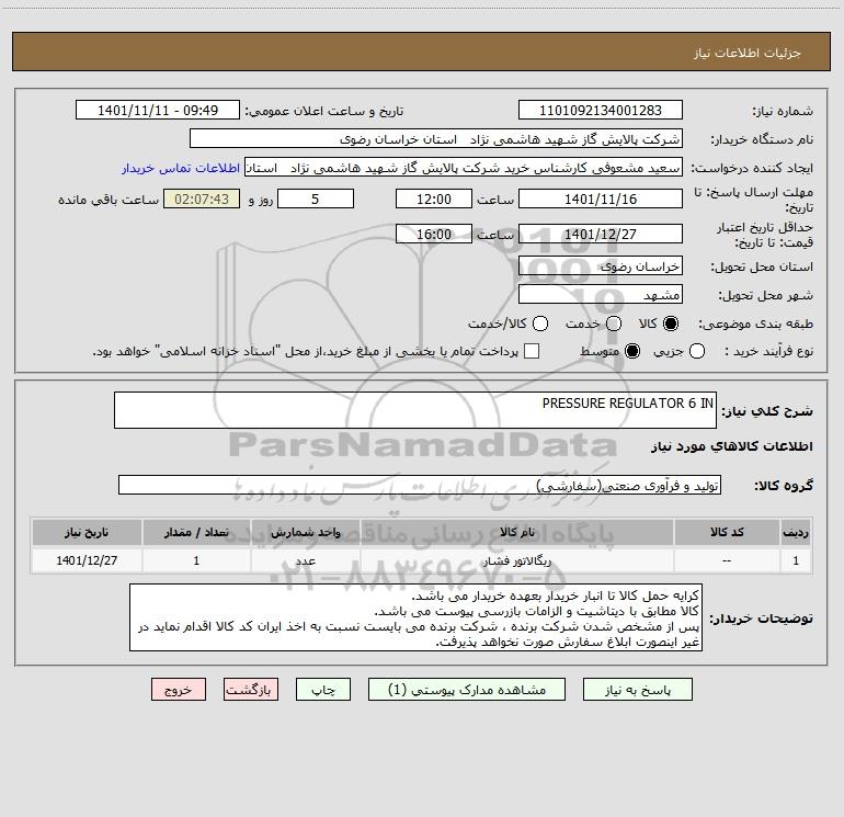 شرح کلی نیاز: PRESSURE REGULATOR 6 IN