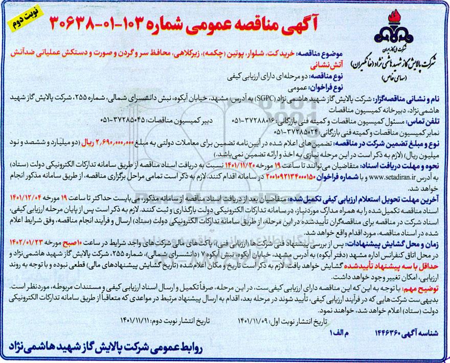مناقصه خرید کت، شلوار، پوتین (چکمه)، زیرکلاهی، محافظ سر و گردن و صورت ... نوبت دوم, مناقصه خرید کت، شلوار، پوتین (چکمه)، زیرکلاهی، محافظ سر و گردن و صورت ... نوبت دوم