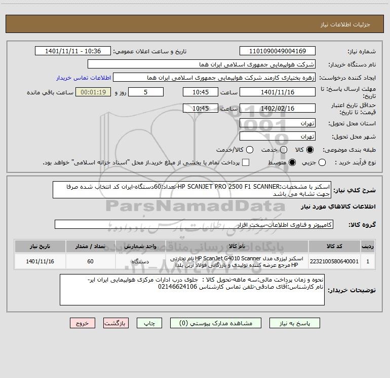 شرح کلی نیاز: اسکنر با مشخصات:HP SCANJET PRO 2500 F1 SCANNER-تعداد:60دستگاه-ایران کد انتخاب شده صرفا جهت تشابه می باشد