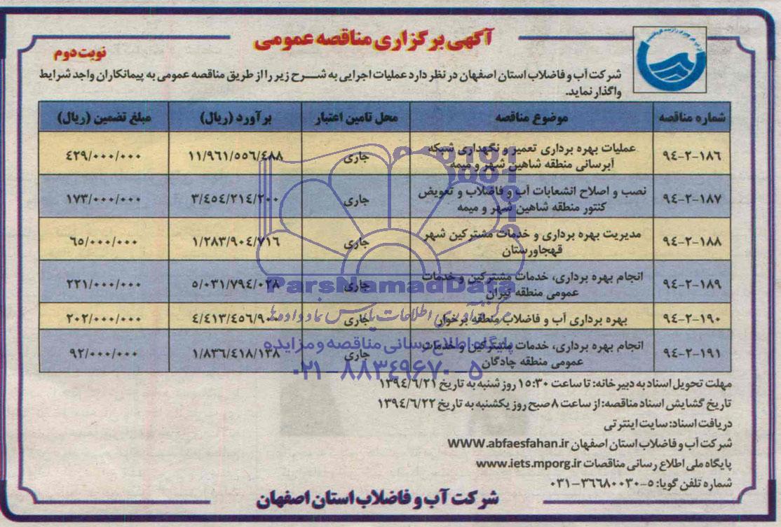 | 94-2-191 | انجام بهره برداری، خدمات مشترکین و خدمات عمومی منطقه چادگان |