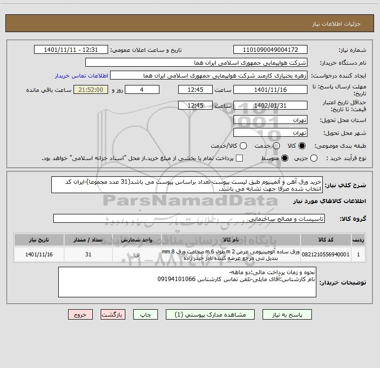 شرح کلی نیاز: خرید ورق آهن و آلمینیوم طبق لیست پیوست-تعداد براساس پیوست می باشد(31 عدد مجموعا)-ایران کد انتخاب شده صرفا جهت تشابه می باشد.