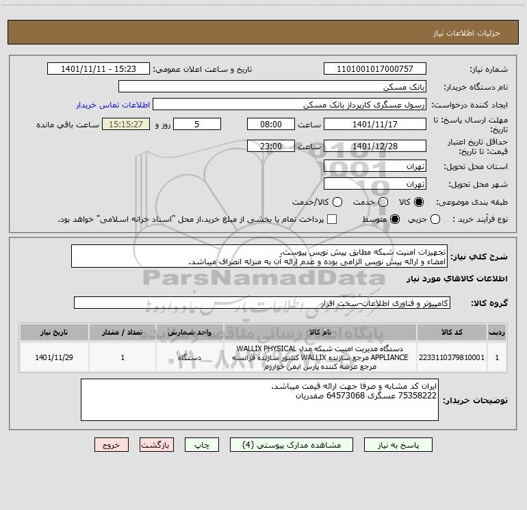 شرح کلی نیاز: تجهیزات امنیت شبکه مطابق پیش نویس پیوست. امضاء و ارائه پیش نویس الزامی بوده و عدم ارائه آن به منزله انصراف میباشد.