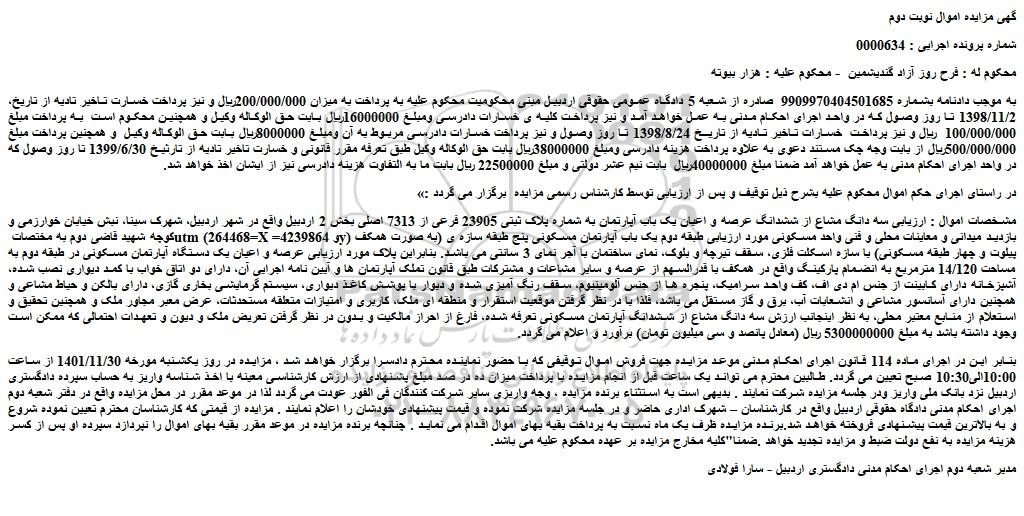 ،به موجب دادنامه بشماره 9909970404501685 صادره از شعبه 5 دادگاه عمومی حقوقی اردبیل مبنی محکومیت محکوم علیه به پرداخت به میزان 200/000/000ریال و نیز پرداخت خسارت تاخیر تادیه از تاریخ 1398/11/2 تا روز وصول که در واحد اجرای احکام مدنی به عمل خواهد آمد و نیز پرداخت کلیه ی خسارات دادرسی ومبلغ 16000000ریال بابت حق الوکاله وکیل و همچنین محکوم است به پرداخت مبلغ 100/000/000 ریال و نیز پرداخت خسارات تاخیر تادیه از تاریخ 1398/8/24 تا روز وصول و نیز پرداخت خسارات دادرسی مربوط به آن ومبلغ 8000000ریال بابت حق الوکاله وکیل و همچنین پرداخت مبلغ 500/000/000ریال از بابت وجه چک مستند دعوی به علاوه پرداخت هزینه دادرسی ومبلغ 38000000ریال بابت حق الوکاله وکیل طبق تعرفه مقرر قانونی و خسارت تاخیر تادیه از تارثیخ 1399/6/30 تا روز وصول که در واحد اجرای احکام مدنی به عمل خواهد آمد ضمنا مبلغ 40000000ریال بابت نیم عشر دولتی و مبلغ 22500000 ریال بابت ما به التفاوت هزینه دادرسی نیز از ایشان اخذ خواهد شد.
