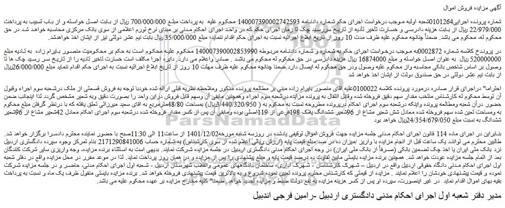 شماره پرونده اجرایی0101264شعبه اولبه موجب درخواست اجرای حکم شماره دادنامه 140007390002742593 محکوم علیه به پرداخت مبلغ 700/000/000 ریال از بابت اصل خواسته و از باب تسبیب به پرداخت 22/979/000 ریال از بابت هزینه دادرسی و خسارت تأخیر تأدیه از تاریخ سررسید چک تا زمان اجرای حکم که در واحد اجرای احکام مدنی بر مبنای نرخ تورم اعلامی از سوی بانک مرکزی محاسبه خواهد شد در حق محکوم له، محکوم می باشد. ضمناً چنانچه محکوم علیه ظرف مدت 10 روز از تاریخ ابلاغ اجرائیه نسبت به اجرای حکم اقدام ننماید؛ مبلغ 35/000/000 ریال بابت نیم عشر دولتی نیز از ایشان اخذ خواهدشد.
