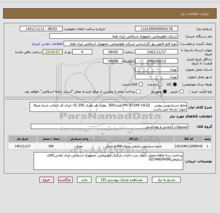 شرح کلی نیاز: مایع دستشویی پیچی PN: 873AP-19-22 تعداد500 بطری هر بطری 250 CC ،ایران کد انتخاب شده صرفا جهت تشابه می باشد.