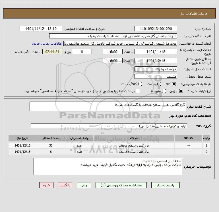 نام دستگاه خریدار:شرکت پالایش گاز شهید هاشمی نژاد استان خراسان رضوی